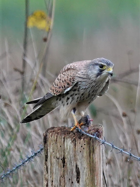 Terwijl het begon te miezeren kwam aan de overkant van de Blokkendijk een torenvalk aanvliegen om vlak bij me een middaggebed in te zetten. Binnen een halve minuut was het raak, een succesvolle duikvlucht. Met een goed zichtbare woelmuis in z'n klauwen. Op weg naar een brede paal aan de Petersdijk om de smakelijke hap te verorberen. De vlucht heb ik aardig vast kunnen leggen, het bidden niet vanwege tegenlicht.